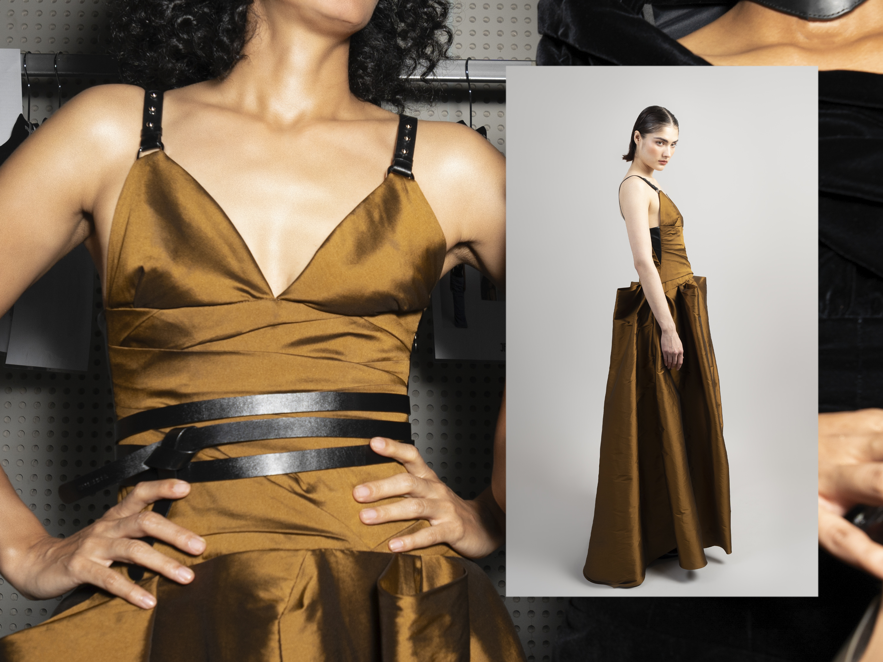 view of a sculpted vision from unexpected textures—pairing of fabric and embellishments,